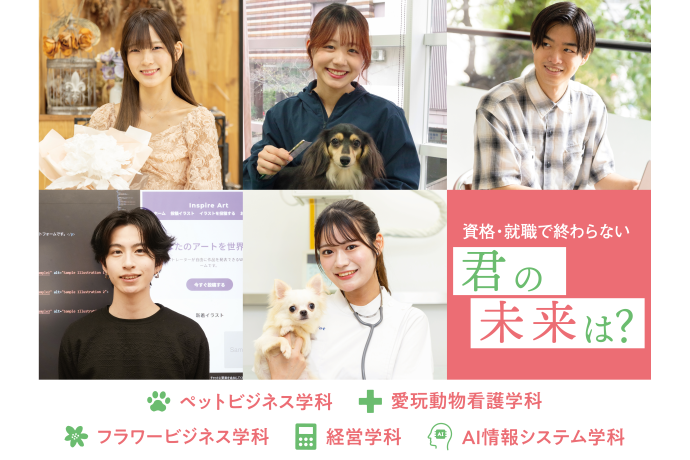 トリマー、ドッグトレーナー、愛玩動物看護、フラワー、経営、オフィス、マーケティング、宅建、IT・プログラミングなど、多彩な分野のスペシャリストを目指せる、福岡県認可の専門学校です。